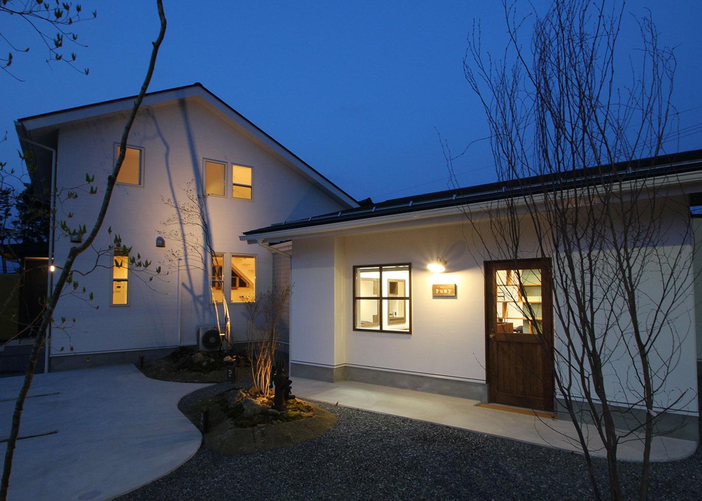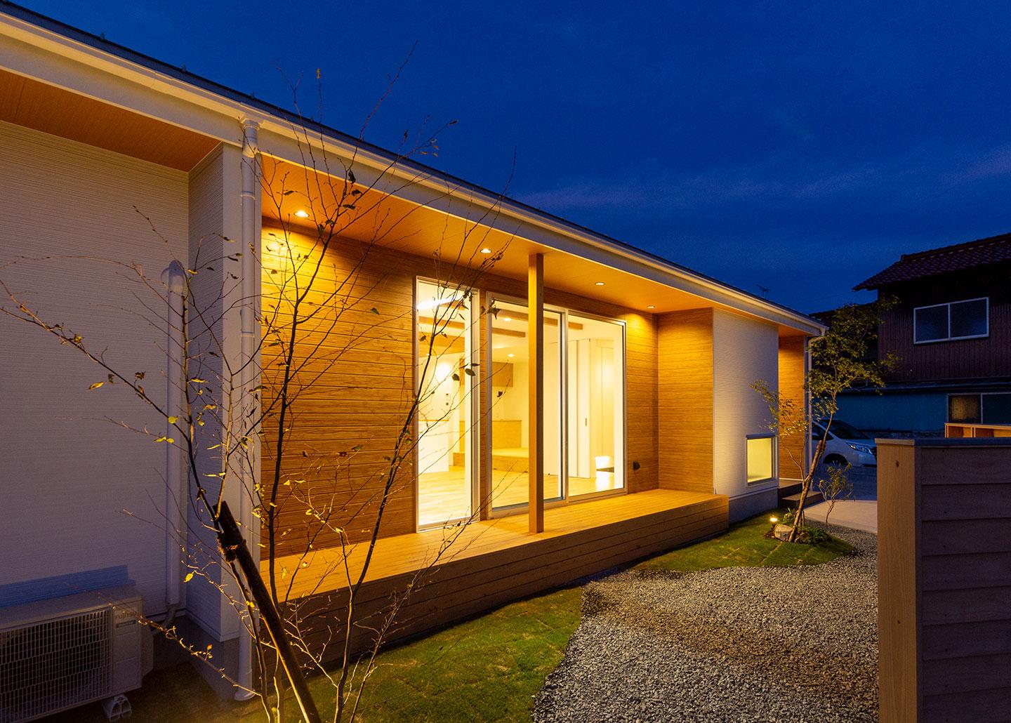 空間の広がりが心地よく、インテリアが映える室内、夕暮れに映える外観、リビングの優しい灯かり。